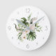 Diese stilvolle Wanduhr besticht durch einen weißen Hintergrund mit einem tropischen Aquarellbild. Das Aquarellbild ist mit grünen Blätter aus Palmen und tropischen Blume in sanften rosa Farbtönen gestaltet. Die Zahlen werden in einem ausgeklügelten, weißen Schriftart gedruckt.