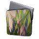 Das Retro-Stoffdesign dieses 13 Zoll großen Laptop-Schlittens wurde von ZoeSPEAK aus einem originellen Foto von langen, dünnen grünen Blätter im späten Nachmittagssonnenlicht erstellt, das hinter der Stuckwand blaue Schatten warf. Die Pflanze sind mexikanische Petunien mit rötlichen Stielen. Die Stimmung ist schlafender Sommernachmittag aus früheren Zeiten.