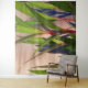 Das Retro-Stoffwerk von ZoeSPEAK auf diesem Wandband wurde aus Zoes Originalfoto von langen, dünnen grünen Blätter im späten Nachmittagssonnenlicht geschaffen, das hinter der Stuckwand blaue Schatten warf. Die Pflanze sind mexikanische Petunien mit rötlichen Stielen. Die Stimmung ist schlafender Sommernachmittag aus früheren Zeiten.
