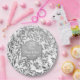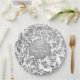 Schöne 25. Hochzeitsplatte mit eleganten Blätter silberner Blumenrahmen auf weißem Hintergrund. Zentriertes silbernes Banner mit Text, der 25 Jahre in Weiß sagt und an ein anderes Jahr angepasst werden kann. Der untere Textbereich kann von Ihnen mit Namen und Datumsangaben angepasst werden.