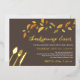 Goldfolie Erntedank Einladung in Braun mit bunten Herbstblättern in Goldfolie mit Löffel, Gabel und Messer in Goldfolie umrissen.
