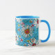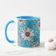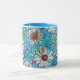 Es handelt sich um eine grafische Komposition, bestehend aus dunklen Blume mit aquamarinen Blütenblättern in Weiß und Hellblau, Gelb, Orange und Rot sowie weiteren Blume im Garten und hellen aquamarinen Blätter auf hellblauem Hintergrund. Sie können die Hintergrundfarbe ändern, indem Sie auf den Button "Personalisieren" klicken und dann auf die Inschrift "Klicken Sie, um weiter anzupassen".