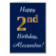 Dieses schlichte Design der Geburtstagskarte zeigt die Meldung "Happy 2nd Birthday", die "2nd" hat ein goldenes Aussehen in den Imitaten. Es verfügt auch über einen benutzerdefinierten Namen und einen dunkelblauen Hintergrund. Es könnte jemandem gegeben werden, der seinen zweiten Geburtstag feiert.