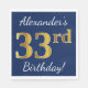 Dieses einfache Papier-Serviettendesign enthält eine Nachricht wie "Alexander’s 33. Birthday!", die "33." hat ein goldenes Aussehen von Imitaten auf blauem Hintergrund. Der Name kann angepasst werden. Es könnte auf einer Geburtstagsparty für jemanden verwendet werden, der seinen dreißigsten Geburtstag feiert. [~Z0000083]