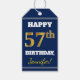 Dieses Geschenktag-Design enthält eine Nachricht wie "HAPPY 57. BIRTHDAY, Jennifer!", wo der Name personalisiert werden kann und wo die Zahl "57." ein Imitat/eine Imitation goldfarbigen Aussehen hat. Die Vorderseite ist mit einem blauen Hintergrund versehen. Auf der Rückseite befindet sich eine "From:"-Zeile. Geburtstagsgeschenke wie diese könnten vielleicht für Geschenke verwendet werden, die jemand zum siebenundfünfzigsten Geburtstag erhält. [~Z0000215]