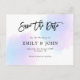 Hübsche Pastelle sind eine tolle Wahl für Hochzeiten im Sommer! Dieses Design verbindet Blues und Lila mit elegantem Schwarz. Der Titel ist in einem beliebten schwarzen Skript. Die Erholung der Typografie kann leicht personalisiert werden und ist in einem vereinfachten Stil, um das künstlerische Gefühl der Überschrift zu ergänzen. Die hübschen pastellfarbenen Hintergrundfarben bleiben auf der Kartenrückseite erhalten.