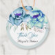 Blau und minzgrün Aquarellfarben Blume Blumenmarken Gastgeschenk Hochzeit. Ein wunderschönes Hochzeitsdesign mit Aquarellfarben-Blume in Blau- und Minzgrün und Blätter. Der Satz "Danke" ist in Schriftzypografie enthalten.