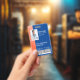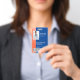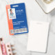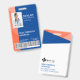 Berufliches und modernes Abzeichen zur Kennzeichnung von senkrechten Fotos. Anpassen mit Foto, Name, Titel, ID-Nummer, Ortsname und optionalem Strichcode. Das vertikale orangefarbene Streifen-Gestaltungselement kann in eine beliebige Farbe geändert werden, um Ihre Marke Anzug. Klicken Sie einfach auf Personalisieren und klicken Sie auf, um weitere Einstellungen zu erhalten. Auf der Rückseite sind Logo, Lage, Adresse und die orangefarbenen und blauen Designelemente zu finden.