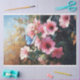 Ein zartes Gemälde mit einem blauen Schmetterling, das zwischen lebhaften rosa Blume flattert und die Schönheit der Natur mit sanftem, anmutigem Charme feiert.