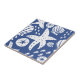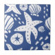 Diese dunkelblaue und weiße Kachel hat ein Strandthema an der Küste mit Seestern, Muscheln, Seeigeln und barfuß Fußabdrücken.