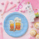 Oktoberfest blaue und weiße Rautenpapier-Teller mit Grafik von zwei Glasbiersteinen und einer Bretzel.