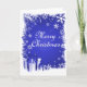 Eine festliche Weihnachtskarte mit einem blauen Weihnachtsgrüßen und Geschenken mit blauen Bändern, umgeben von einem frostigen weißen Rand von Schnee und weißen Schneeflocken.