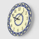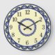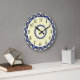 Schöne Kobalt-blaue und weiße Küchenuhr mit einem Hauch von Gelb. Im Großen gezeigt.