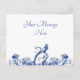 Diese Postkarten sind fertig, um mit Ihrer eigenen Botschaft auf der Vorderseite versehen zu werden und sind im Stil der klassischen Geschirr in Blau und Weiß mit einem Blumenmotiv mit Vogelakzent illustriert. Auf der anderen Seite gibt es viel Platz, um eine längere Nachricht hinzuzufügen.