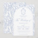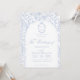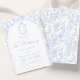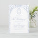 Blaue Hochzeitseinladungskarte mit weichem Delft-Blumendesign, entworfen in einer verfeinerten Mischung aus Chinoiserie- und französischem Toile de Jouy-Stil. Die zarten botanischen Illustrationen umrahmen ein bogenförmiges Layout mit einem eleganten Monogramm eines Hochzeitswappens, perfekt für Paare, die vintage, historische und europäisch inspirierte Ästhetik lieben. Klassische Schrift-Typografie passt wunderbar zur keramikblauen Farbpalette und macht dieses Design zu einer mühelosen Verbeugung vor der Tradition des "Etwas Blau". Vollständig anpassbar mit Ihren Namen, Datum und Ort, ist es eine exquisite Wahl für jedes romantische oder anspruchsvolle Hochzeitsthema.