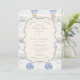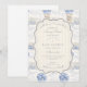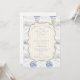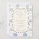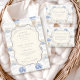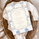 Ein süßes, vintage-inspiriertes Design mit zarten blauen Schleifen, weicher gestreifter Detaillierung und charmanten Blaubeergarten-Illustrationen. Toile-artige Kunstwerke mit niedlichen Tieren und Obstkörben schaffen ein klassisches Märchenbuch-Feeling in einer weichen, pulverblicken Farbpalette. Der aufwendige zentrale Rahmen fügt Eleganz hinzu, während er den Gesamteindruck leicht, verfeinert und zeitlos hält. Perfekt für eine Babyparty mit einem sanften Gartenthema und einem Hauch von traditionellem Charme.