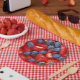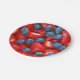Blaubeeren und geschnittener Erdbeerdruckpapier-Teller