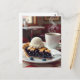 Eine Postkarte, die in Touch mit Freunden oder Familienmitgliedern behalten wird. An der Front befindet sich eine Illustration von Blaubeerkuchen mit schmelzendem Vanilleeis auf der Oberseite mit einer warmen Tasse Kaffee am Abend.
