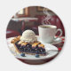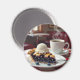 Niedlicher Magnet mit einer Illustration von Blaubeerkuchen mit schmelzendem Vanilleeis auf der Oberseite mit einer warmen Tasse Kaffee am Abend.