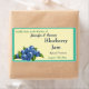 Ein Haufen reifer Blaubeeren mit Blätter sind in der links unteren Ecke dieses Labels mit hellgelbem Hintergrund eingebettet, umgeben von einem Hintergrund aus türkisfarbenem Grün, der das Etikett perfekt für hausgemachte Blaubeermarmeladen oder Konfitüren macht. Der Text befindet sich im Vorlagenformular, sodass Sie ihn auf das ändern können, was Sie möchten.