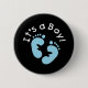 Abdrücke des blauen Babys auf einem schwarzen Hintergrund und einem weißen Text, der "liest, es ist ein Junge!" auf Babymitteilungsknöpfen.