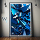 Das ist eine blaue abstrakte Kunst mit blauen Linien auf blauer Oberfläche, im Stil futuristischer Fragmentierung und kubistisch zerschmetterten Flugzeug, mit gestürzten geometrischen Kompositionen, dekonstruierten Objekten, metallischen Oberflächen, fetten Schatten und scharfen Winkeln.