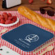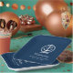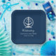 Moderne Hochzeitspapier-Teller mit Hochzeitszettel in einem Bootanker mit Seilknotenrahmen und individuellem "Feierungstext". Navy Blau und Weiß Farbschema.