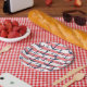 Sommer-Design mit marineblau Ankermuster auf einem Korallen und weißen Streifen Hintergrund.