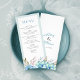 Fügen Sie Ihrem Hochzeitstisch eine Touch von Eleganz und Charme hinzu, mit dieser hübschen Speisekarte, die ein Blumenmotiv aus Aquarellfarben-Blume und Blätter in Blau- und Grüntönen zeigt. Die Karte hat einen zarten, hellblauen Rahmen, der die Menüelemente umrahmt. Auf der Kartenrückseite können Sie die Namen der Braut und des Bräutigams in einem stilvollen Script-Schriftart sehen.