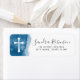 Elegante Taufen, Kommunion oder Bestätigungs-Rücksendeadressen-Aufkleber mit einem weißen Kreuz auf dunkelblauem Aquarellhintergrund und Ihr Name mit einem Kalligraphie-Script-Schriftart hervorgehoben.