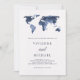 Weltkarte Hochzeitseinladung mit trendig blauen Aquarellfarben Kontinenten und einem weißen, Aquarellpapier-Look Hintergrund. Die Rückseite der Einladung ist mit einem blauen Aquarellbild bedeckt.