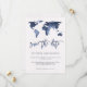 Diese schicke, moderne Hochzeit speichert die Datumskarte mit einem weißen, Aquarellpapier-Hintergrund mit einem trendigen blauen Aquarellbild Weltkarte und passendem Text. Ideal für die Hochzeit von allen Paaren, die Lieben zu reisen, oder alle, die eine Hochzeit in Urlaubsort haben.