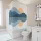 Abstrakte farbenfrohe Abbildung des Sonnenaufgangs mit blauen Bergen, die sich im See widerspiegeln