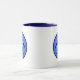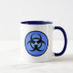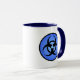 Schwarze Biogefährdung auf einem blauen kreisförmigen Hintergrund. Erstellt eine ausführliche Erklärung über den Bürokaffee. Wahl der Keramik, der Reisetasche aus Glas oder Edelstahl.