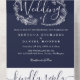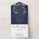 Alles in einer Hochzeitseinladung mit hübschen Saitenlichtern, handgezeichnet Blumengarten und schicker Typografie auf marinebasischem Hintergrund. Die Einladung enthält eine perforierte RSVP-Karte, die für Sie individuell adressiert oder links als leere Karte für die Handschrift der Adressdaten Ihres Gastes verwendet werden kann. Entwickelt von Thisisnotme©