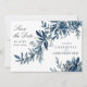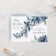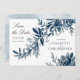 Interessante, moderne und elegante Hochzeit Save the Date Einladung mit blauen indigoischen Blume und Blätter in Aquarell. Entlockt gemalte Blumen mit Konturen. Eine einzigartige Karte mit horizontalem Design. Das Farbschema macht die Karte für eine Winterhochzeit geeignet.