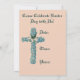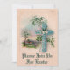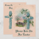 Dieses Vintage Christliche Osterpostkartenbild mit einem Kreuz aus blauen Blumen und einem wunderschönen Bauernhof im Frühling im Hintergrund wird hier auf dieser Einladung gedruckt.