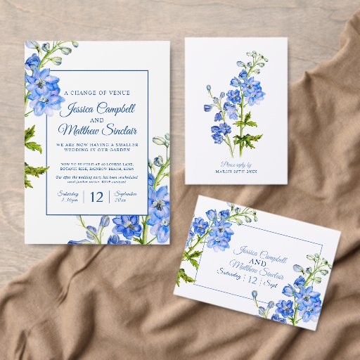 Schöne Delphinium Spikes gemalt blau botanische Kunst Aquarell Wechsel des Austragungsortes, Freiluft-Garten Hochzeit Einladung. Bearbeiten Sie diese Hochzeitseinladung mit Ihrem eigenen Namen, Veranstaltungsdetails, Wortlaut und Verlobung oder einem anderen Foto auf der Rückseite oder entfernen Sie das Foto und haben stattdessen nur ein Blumenmuster. Andere passende Hochzeitsartikel sind erhältlich. Einzigartiges Design und originelle Aquarellmalerei von Sarah Trett. www.sarahtrett.com für www.mylittleedenweddings.com