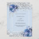 Ein hellblauer Hintergrund mit blauen Rose, Blume und Imitaten verziert silberne Konfetti. Personalisieren und fügen Sie Ihre Namen und Hochzeitsdetails. Schwarze Buchstaben.