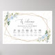Fügen Sie Ihrer Hochzeitsfeier eine persönliche Touch mit diesen stilvollen und unvergesslichen Party hinzu! Das Design ist in Blau-Weiß-Blume, Grün, Goldkonfetti und Goldrahmen auf weißem Hintergrund gehalten.