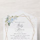 Laden Sie Freunde und Familie stilvoll ein und setzen Sie den Ton für Ihren besonderen Tag mit dieser charmanten Babyparty-Einladung. Das Design zeigt blaue und weiße Aquarellblumen, Grün, goldenes Konfetti und einen goldenen Rahmen auf weißem Hintergrund.