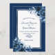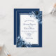 vorne: Ein marineblau Hintergrund mit einem einfachen Imitat silber und weiß. Die Rose sind mit blauen Blumen geschmückt. Vorlagen für Ihre Namen und Hochzeitsdetails. Die Namen werden mit handgeschriebenen Stilskripten, blauen Buchstaben geschrieben. Zurück: Navy blauer Hintergrund.