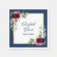 Eine trendige bohemianische Serviette für eine Hochzeit oder Hochzeit. Dekoriert mit wasserfarbenen Rose in Bordeaux mit Grün. Eleganter marineblau-weißer Hintergrund. Ein Imitat Goldrahmen. Vorlagen für Namen und Datum. Die Namen werden mit einem handgeschriebenen Stilskript geschrieben. Navy blaue Buchstaben.