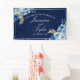 Elegante Rosen in Blau und Weiß schmücken dieses wunderschöne Blumenbanner für Hochzeitsgäste im Abend. Das elegante, weiße Rechteck wird durch hübsche indigofarbene Blume und einen zauberhaften, hellgelben botanischen Kragen hervorgehoben. Die Namen des Ehepaares sind in einer klassischen weißen Kursiv-Schrift innerhalb des Rechtecks dieser modernen Wintergunst für eine zeitgenössische Braut geschrieben.