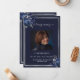 Ein elegantes zweiseitiges Programm. Ein dunkelblauer Hintergrund, ein silbernes Imitat, blaue Blumen und Platz für ein Foto. Personalisieren und hinzufügen von Namen, Daten und Text.