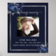 Ein dunkelblauer Hintergrund, ein silbernes Imitat, blaue Blumen und Platz für ein Foto. Personalisieren und hinzufügen von Namen, Daten und Text.