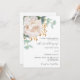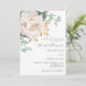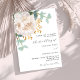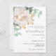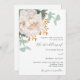 Ein schick weißer Hintergrund. Weiße Blumen, Blume aus Pinien und grüne Eukalyptus-Blätter in Aquarelltönen, Gewürze, Grünpflanzen und Imitate, goldene Zierpflanzen. Personalisieren und fügen Sie Ihre Namen und Hochzeitsdetails.