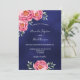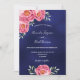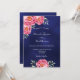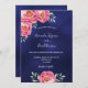 Eine trendige, moderne Einladung zur Hochzeit. Ein dunkelblauer marineblauer Hintergrund. Die blaue Farbe ist ungleichmäßig. Blume, Blumen und ein wenig Graugrün sind mit üppig rosafarbenen Toronies geschmückt. Vorlagen für Ihre Namen und Zeremonie Informationen. Die Namen werden mit einem modernen handgeschriebenen Stilskript geschrieben. Weißer Text. Zurück: blauer Hintergrund.