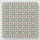 Ein gemusterter Untersetzer mit einem Glas Wasser und einer Zitronenscheibe liegt auf einer grauen Oberfläche. Der Untersetzer hat ein geometrisches Design in Blautönen, Braun und Weiß.