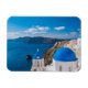 Wunderschönes Foto der ikonisch blauen Kirchenkuppeln von Aghioi Theodoroi (Heilige Theodore), das man auf der Klippe von Santorini Island, Griechenland sehen kann.